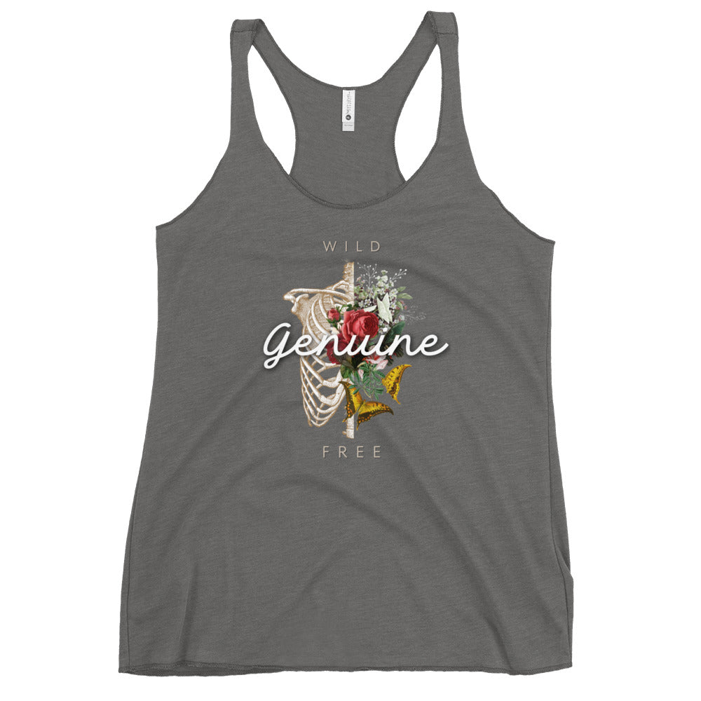 Wild, Free, GENUINE. Floral skeleton illustration. This racerback tank is soft, lightweight, and form-fitting with a flattering cut and raw edge seams for an edgy touch.